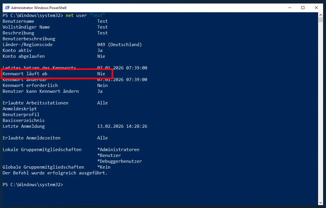 Die aktuellen Einstellungen eines Benutzerkontos können – jeweils als Administrator ausgeführt – sowohl über die PowerShell als auch über die Eingabeaufforderung mit folgendem Befehl ausgegeben werden: